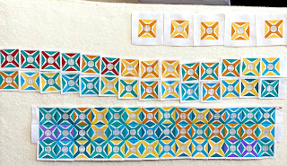 The blocks were trimmed and sewn together. Because the blocks were painted I couldn't put pins to aid me in my task. Pins would have left a nice hole mark on the fabric. Instead I used clips shown below - they worked wonderful.