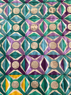 The three layers were put together and quilted in my home sewing machine. I had to be careful and go very, very slow since the quilt had been painted and infused with newspaper. Mistakes couldn't be made. Talk about pressure!!