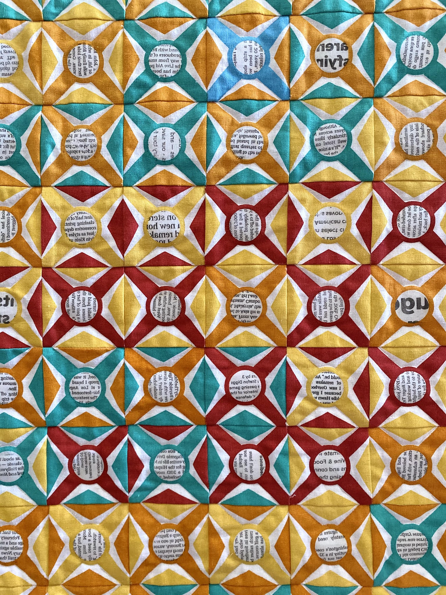 The three layers were put together and quilted in my home sewing machine. I had to be careful and go very, very slow since the quilt had been painted and infused with newspaper. Mistakes couldn't be made. Talk about pressure!!
